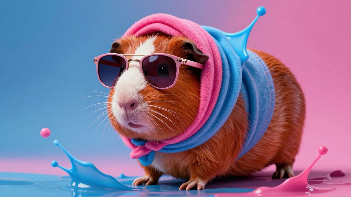 This hyperrealistic splash art depicts a capybara wearing a vibrant pink and blue punk wig and sunglasses. The image features intricate details, dramatic lighting, and a colorful background.