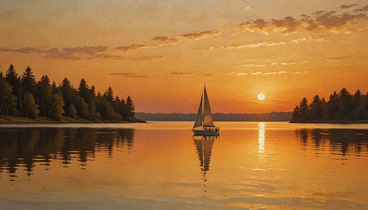 This image captures a serene moment with a single sailboat on a golden lake during sunset. It features painterly ripples and a warm, nostalgic glow in an impressionist style.
