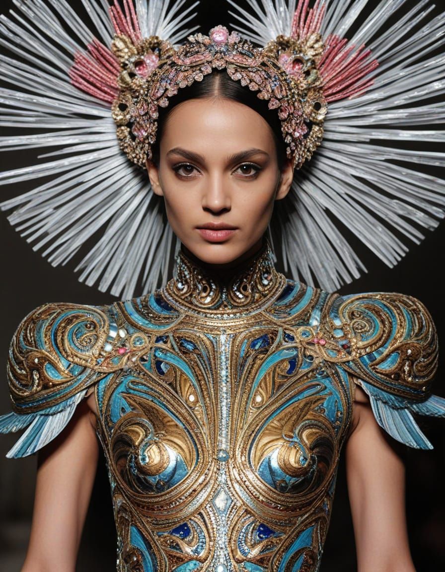 This image showcases avant-garde haute couture, blending the vibrant, playful aesthetic of Manish Arora with the innovative, sculptural designs of Iris van Herpen.