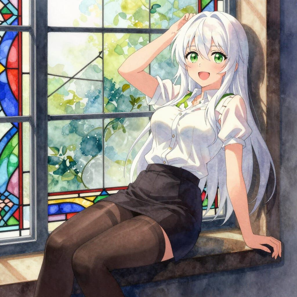 This image depicts a smiling young woman with white hair and green eyes, wearing a cute outfit, positioned by a stained glass window. Rendered in a watercolor anime style with deep colors and cel-shading.