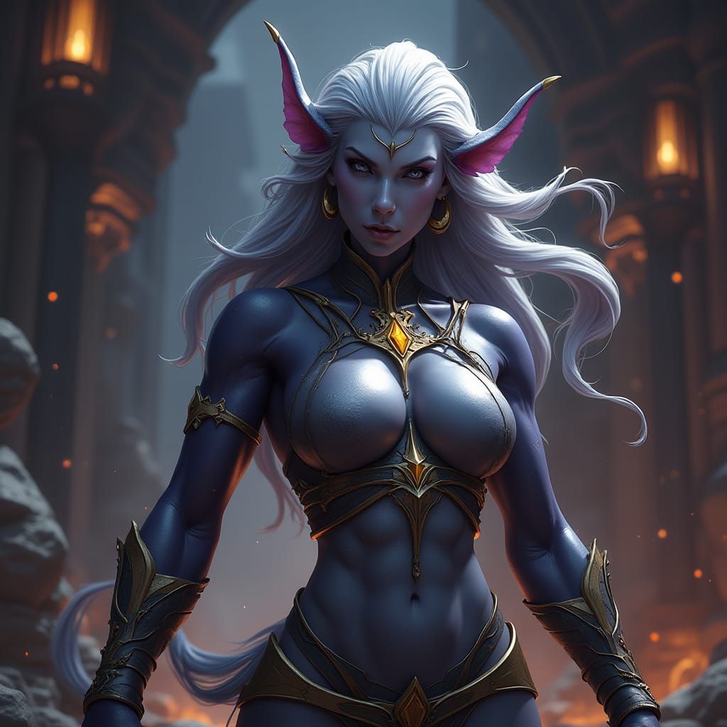 This image shows an amused, muscular female drow warrior in a dark fantasy concept art style. Features hyperdetailed, intricate elements with dramatic lighting and complementary colors.