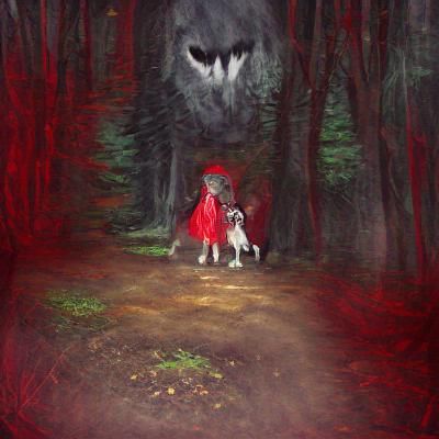 This image depicts a wolf and Red Riding Hood in a dark, eerie forest. The scene evokes a sense of foreboding and suspense, capturing the classic fairytale.