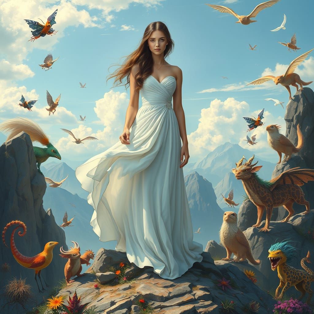 This image depicts a serene young woman standing atop a mountain, surrounded by fantastical creatures in a dreamlike scene that blends realism with vibrant colors and intricate details, evoking a sense of enchantment and wonder.
