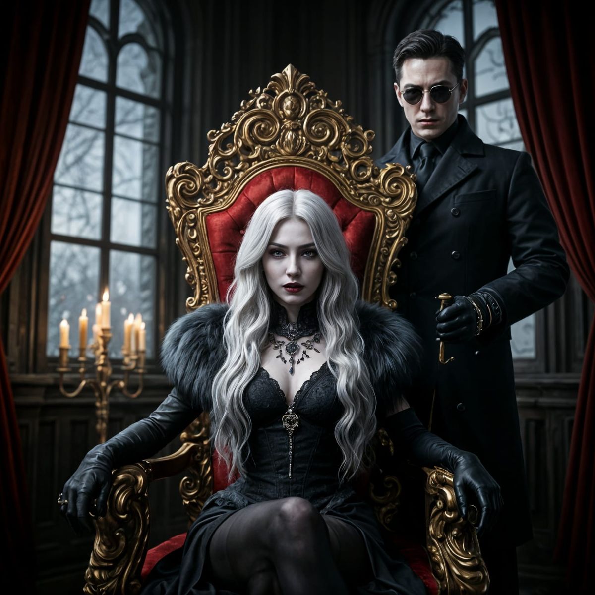 This dark, hyperrealistic image captures a powerful vampire queen in a luxurious gothic setting. She sits on a red velvet throne, surrounded by rich textures and mysterious shadows, with a brooding vampire bodyguard standing guard.