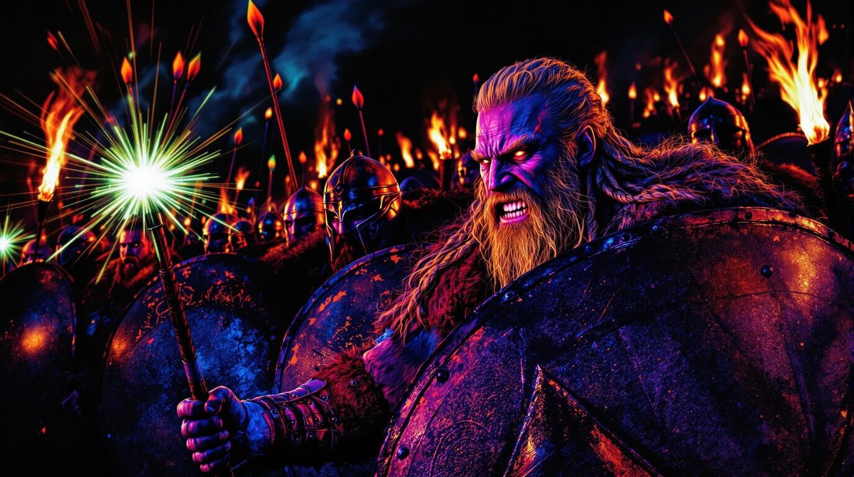 This image depicts Viking warriors in a shield wall, featuring grim faces and battle-worn expressions. The scene is rendered in a stylized Art Nouveau manner with ultraviolet-inspired colors and dramatic lighting.