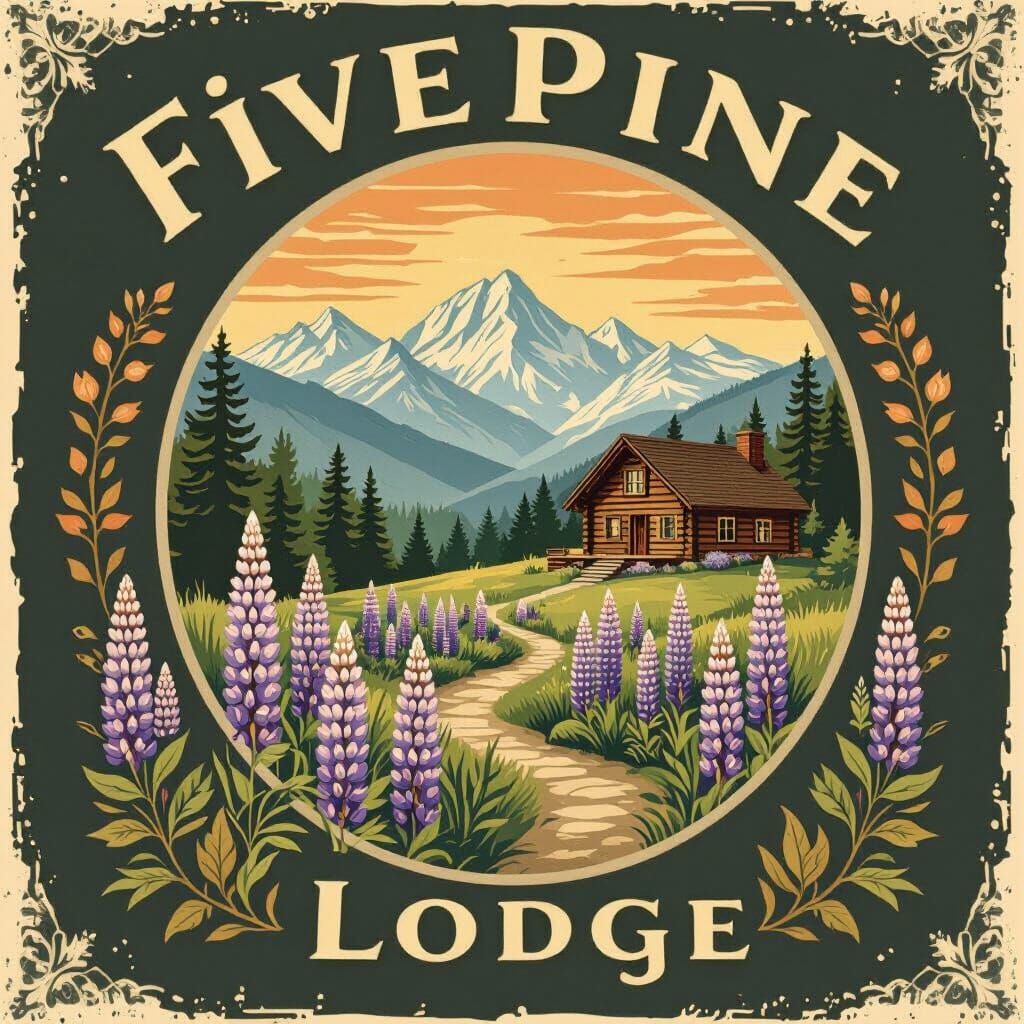 This image shows a vintage travel logo for FivePine Lodge, featuring a mountain scene with lupine flowers and a rustic cabin. The design uses earthy tones and intricate details.