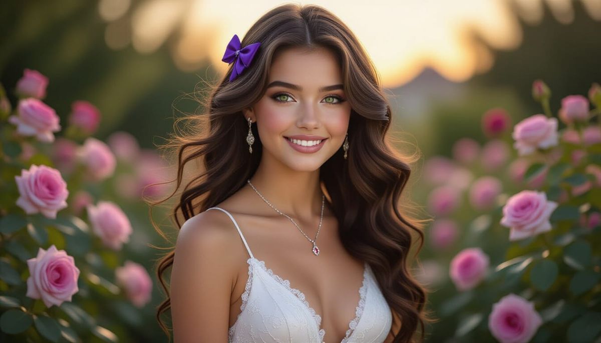 A hyperdetailed portrait of a young woman with curly brunette hair and green eyes in a rose garden at dusk. The art style is dark fantasy with dramatic lighting and complementary colors.