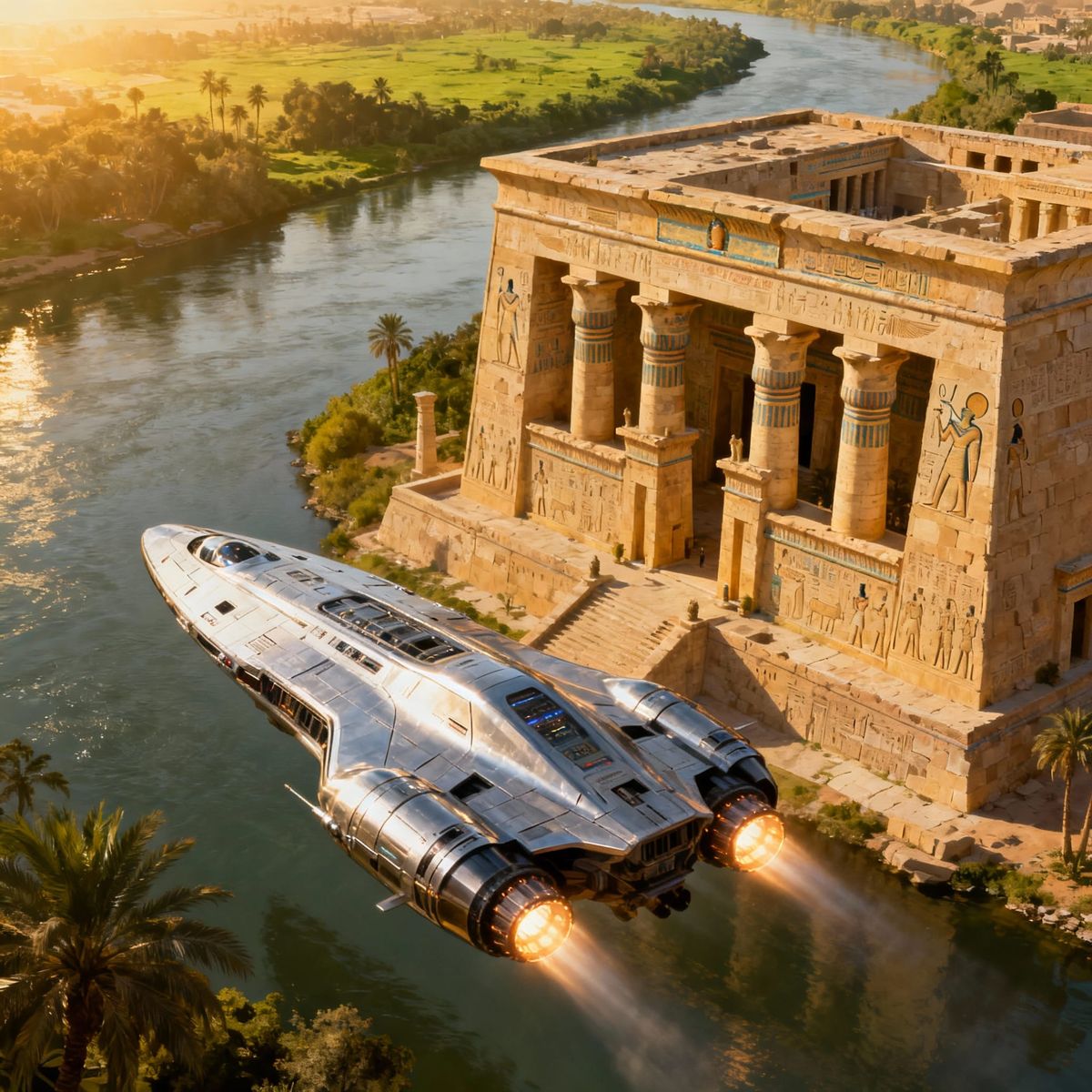 This image depicts an ancient Egyptian palace on the Nile riverbanks with a futuristic hypersonic starship making a landing nearby.