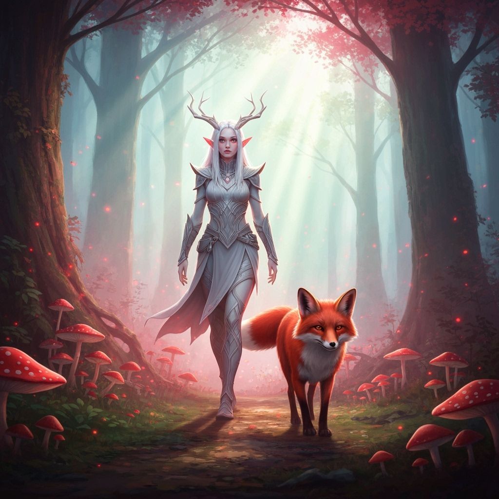 This image shows a white elven girl with silver hair and a red fox in a magical forest. Ethereal sunlight and glowing mushrooms create an otherworldly atmosphere with a mystical red glow.