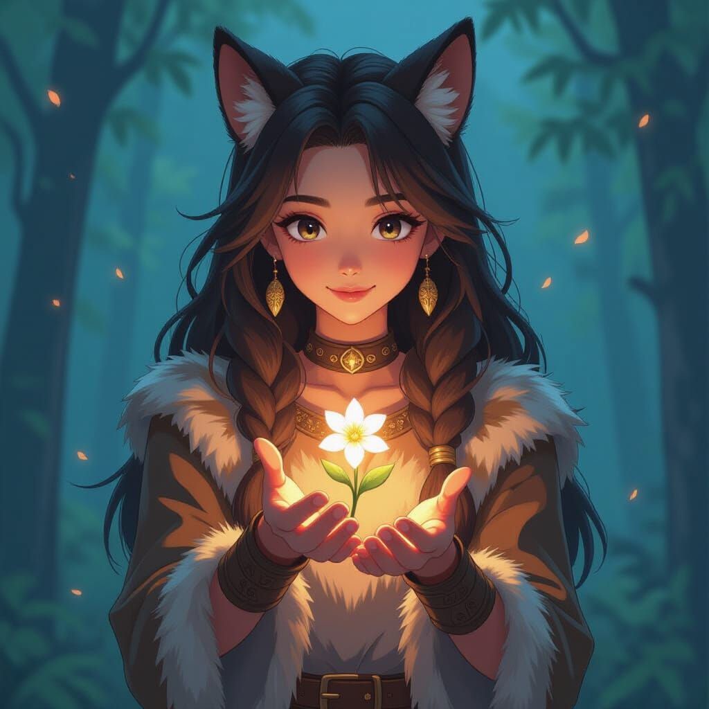 This image shows a young woman in animal-skin clothing presenting a glowing flower. The artwork features cinematic lighting and cel-shaded anime style.