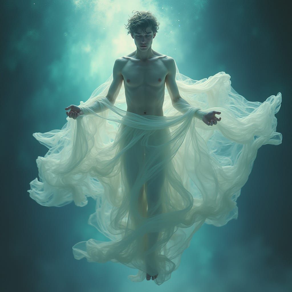 This image features an androgynous figure in a weightless environment, surrounded by a soft, luminescent glow and intricate, symbolic patterns, evoking the fluidity of the 5th dimension and the surreal quality of surrealist art.