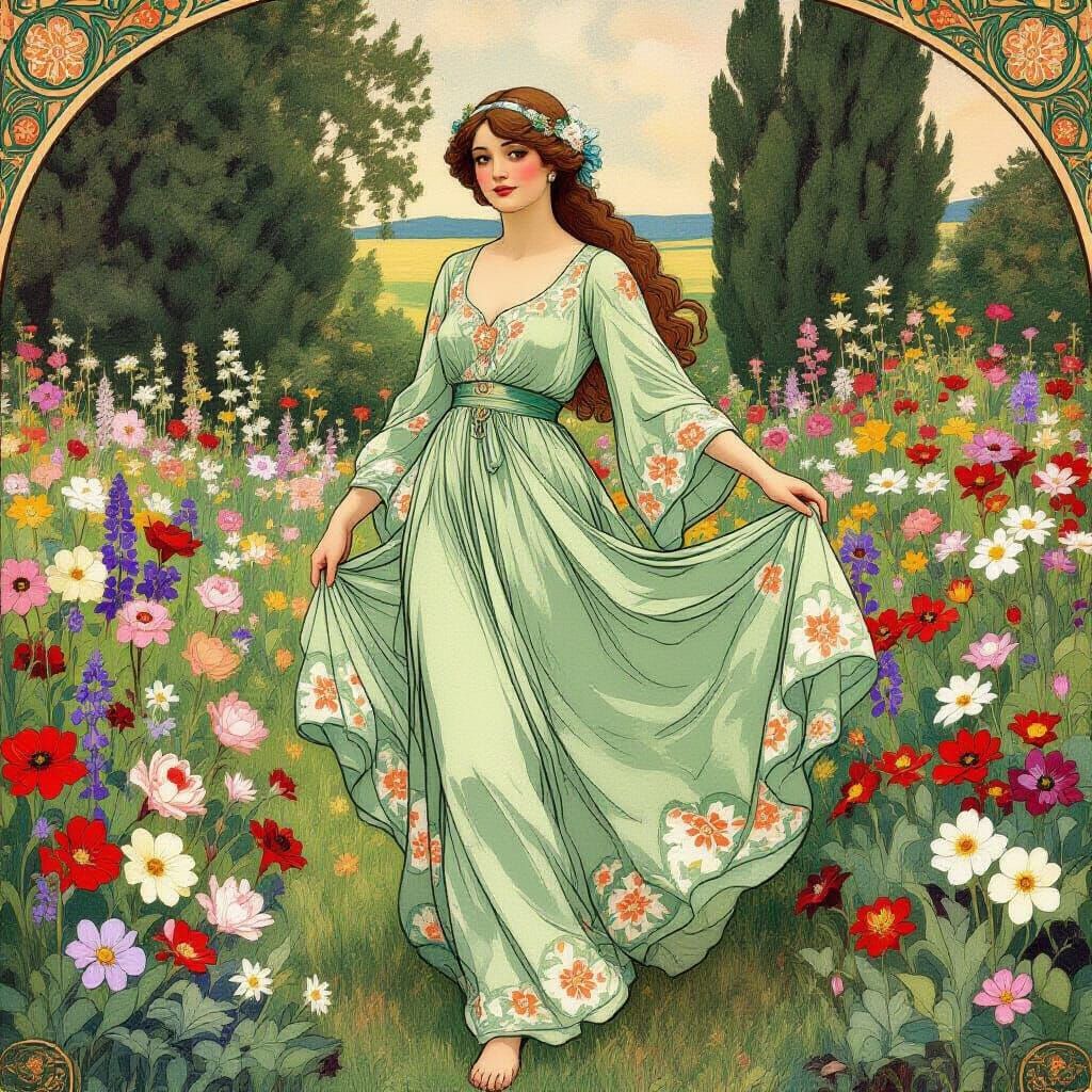A vibrant image of a woman in a flowing green dress standing in a lush garden filled with colorful flowers. The artwork is reminiscent of art nouveau paintings.