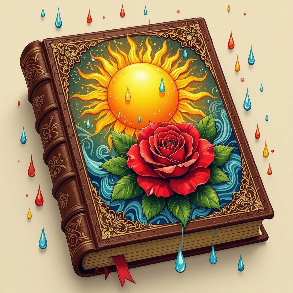 This image shows a vintage book titled 'Sunshine After the Rain' decorated with roses and sunshine, with rain droplets falling. The artwork blends fractal patterns and 3D shading in a digital art style.