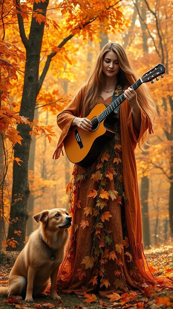 This image captures a mystical moment in an enchanted forest, where a bard with flowing hair and autumn leaf robes passionately plays classical guitar, surrounded by a woman with auburn hair, a loyal dog, and vibrant foliage, in a dreamlike atmosphere with warm, golden, and surreal colors.