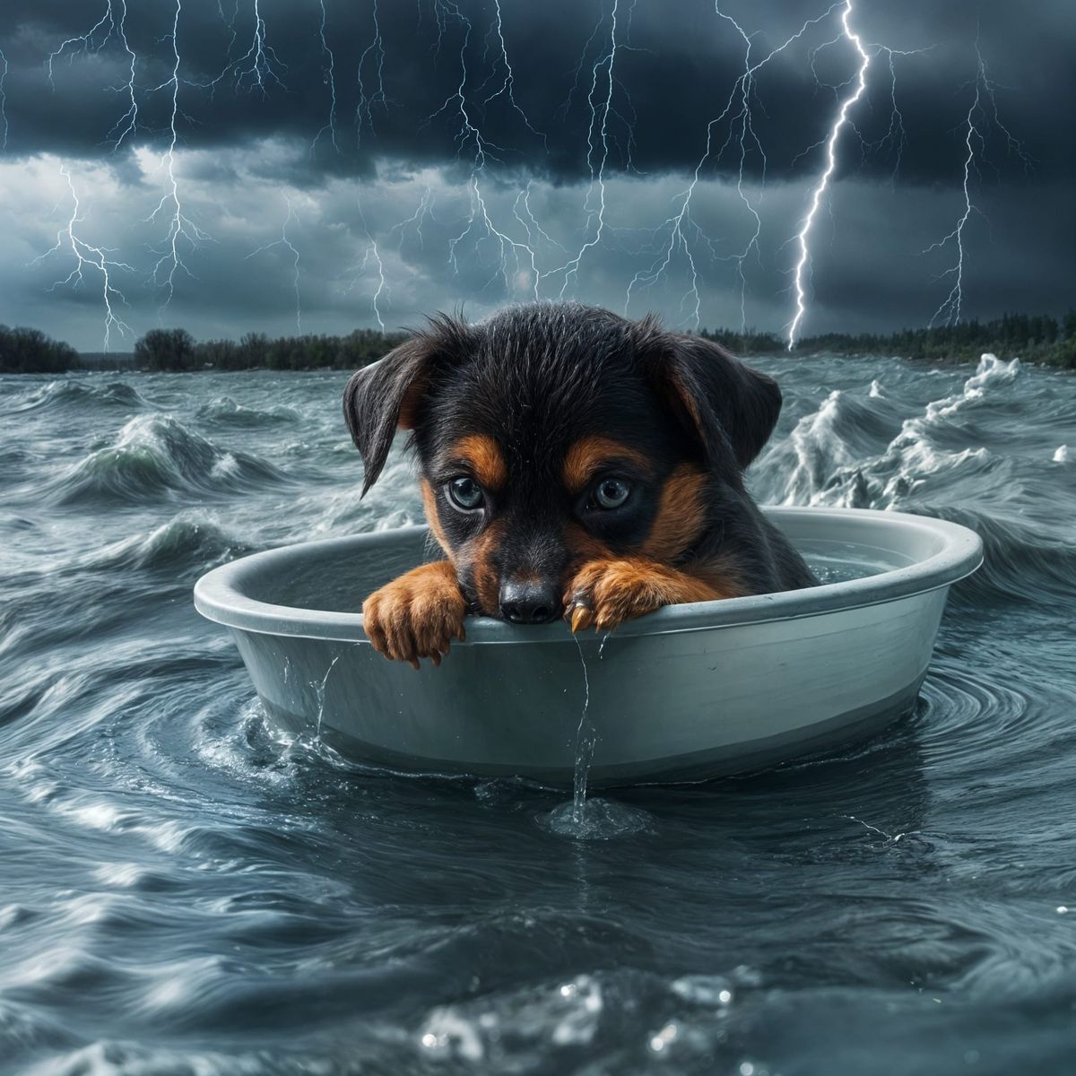 This image shows a small, frightened puppy adrift in a plastic bowl on a rain-swollen river. The poor pup is soaking wet and looks very scared as it floats downstream.