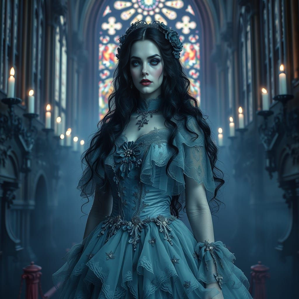 This image showcases a captivating blend of gothic art and maximalist romanticism, set against a backdrop of cool, vibrant tetradic colors. A striking fusion of beauty and beast, this piece exudes elegance and mystery.