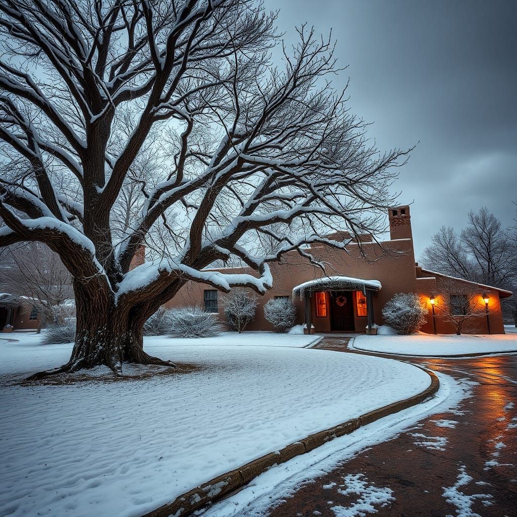 This image shows a snow-covered tree in Santa Fe, New Mexico. The pueblo-style home and wintry scene are captured in hyperrealistic detail with high contrast and cinematic lighting.