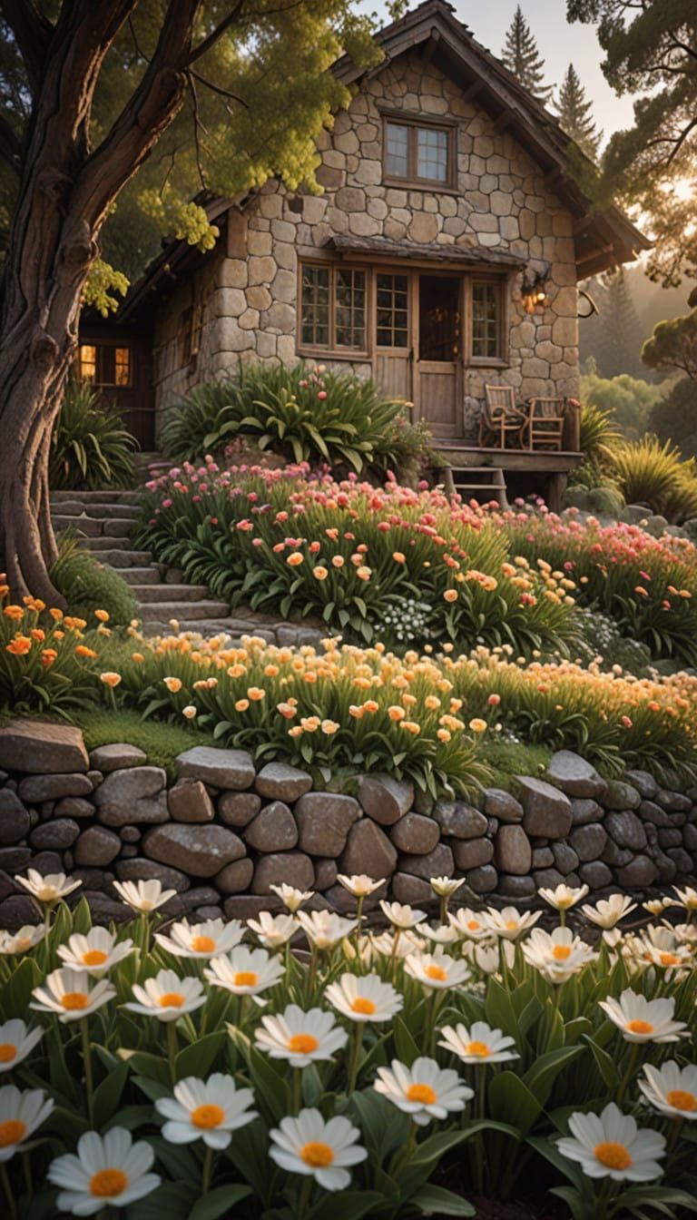 A serene image of a stone cottage enveloped by a flourishing garden. Soft, golden light streams through the windows, enhanced by a shallow depth of field and creamy bokeh, in the style of fine art landscape photography.