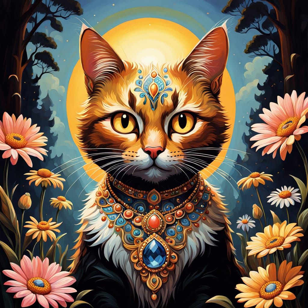 This concept art features a detailed, stylized cat with floral patterns and a pearl necklace. The background is a vibrant floral scene, rendered in a grainy oil paint illustration with a dreamy mood.