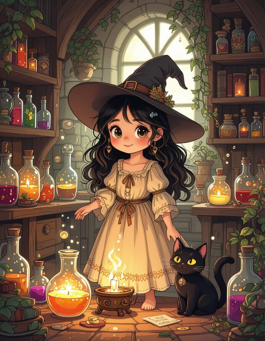 A Hispanic witch girl with her feline friend in a cozy cottage filled with magical items. The artwork features intricate ink lines and tea-stained colors, creating a mystical ambiance.