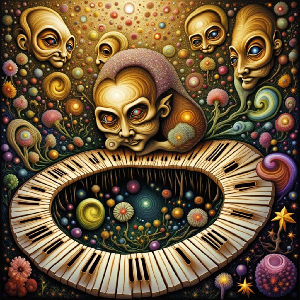 A surreal image of a goblin-human hybrid in a detailed art installation with floral wallpaper and mirrors. Features piano key bridges and cosmic elements.