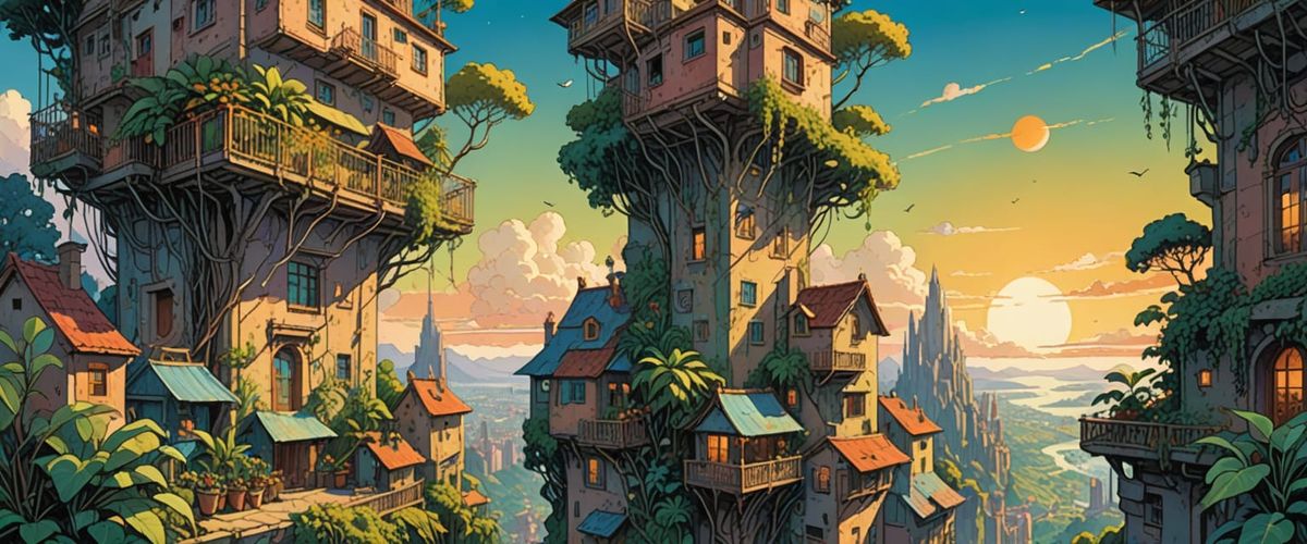 This image shows a whimsical floating city with lush tropical plants, bathed in soft golden hour light. Rendered in a retro comic book style with vibrant pastels.
