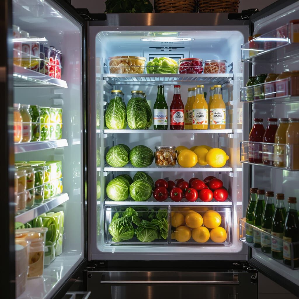 This image showcases a brightly lit cold storage room filled with fresh produce on shelves. Realistic details such as glass condensation and metallic reflections are rendered in a professional photographic style.