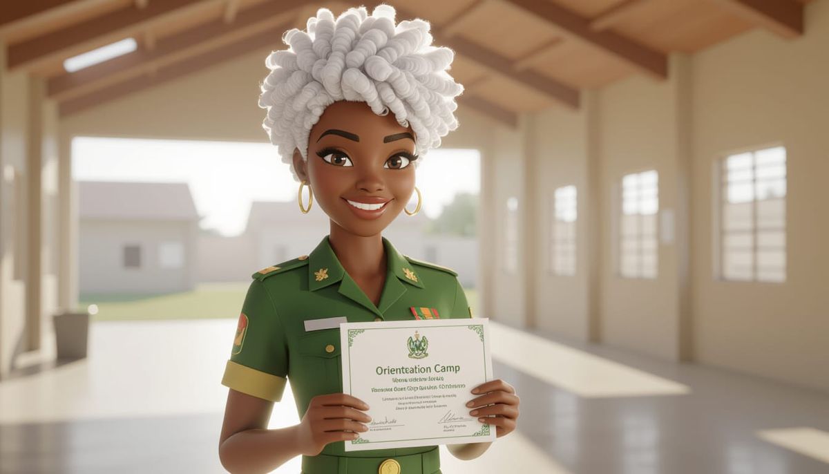 This image shows a realistic, animated-style portrait of a smiling young African woman in a Nigerian NYSC uniform, holding a certificate. Features vibrant curly hair and dramatic lighting.