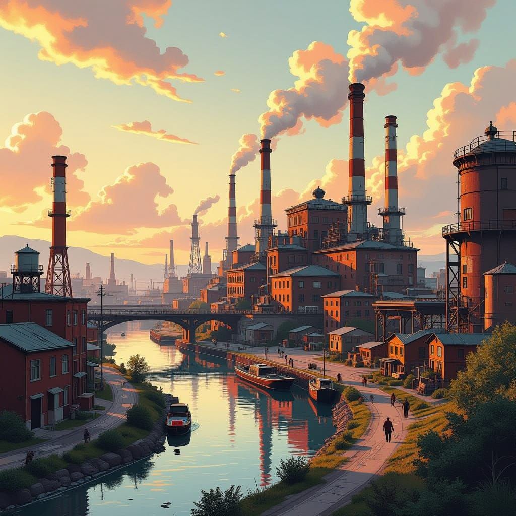 A vibrant dieselpunk landscape featuring vintage factories and scenes of daily life. The image is rendered with a nostalgic color palette and gritty textures, evocative of industrial design.