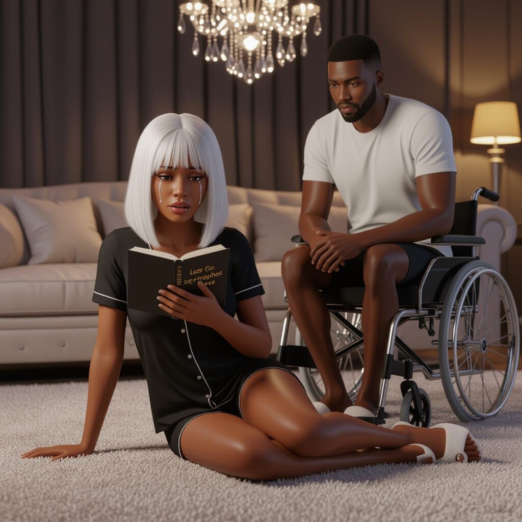 This image depicts a hyper-realistic animated scene of a distressed African woman in pajamas, lying on a carpeted floor. A man stands over her, showing concern, with a wheelchair nearby. The lighting enhances the emotional intensity.