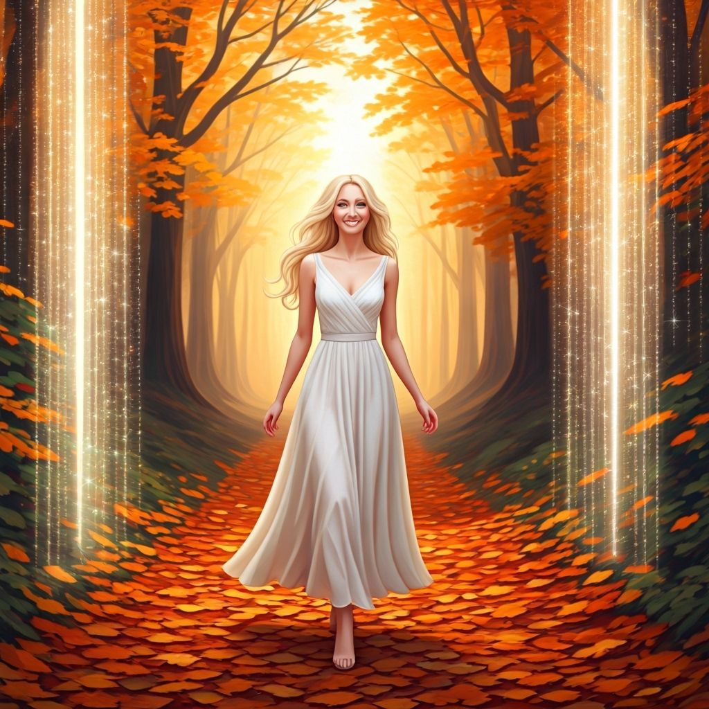 A joyful blonde woman walks through a vibrant autumn forest, with falling leaves and cascading star waterfalls. Bathed in soft, glowing pastel light, the dreamlike scene sparkles with ethereal elements.