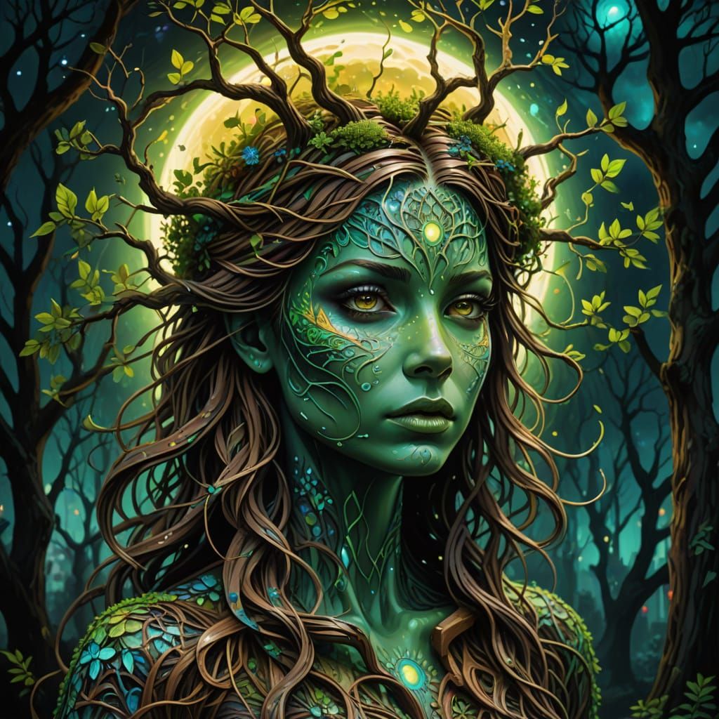 This image shows a breathtakingly detailed and surreal depiction of a woman's transformation into a tree, with intricate branches and foliage growing from her hair, set against a vibrant and colorful backdrop of a full moon and prismatic rainbow light.
