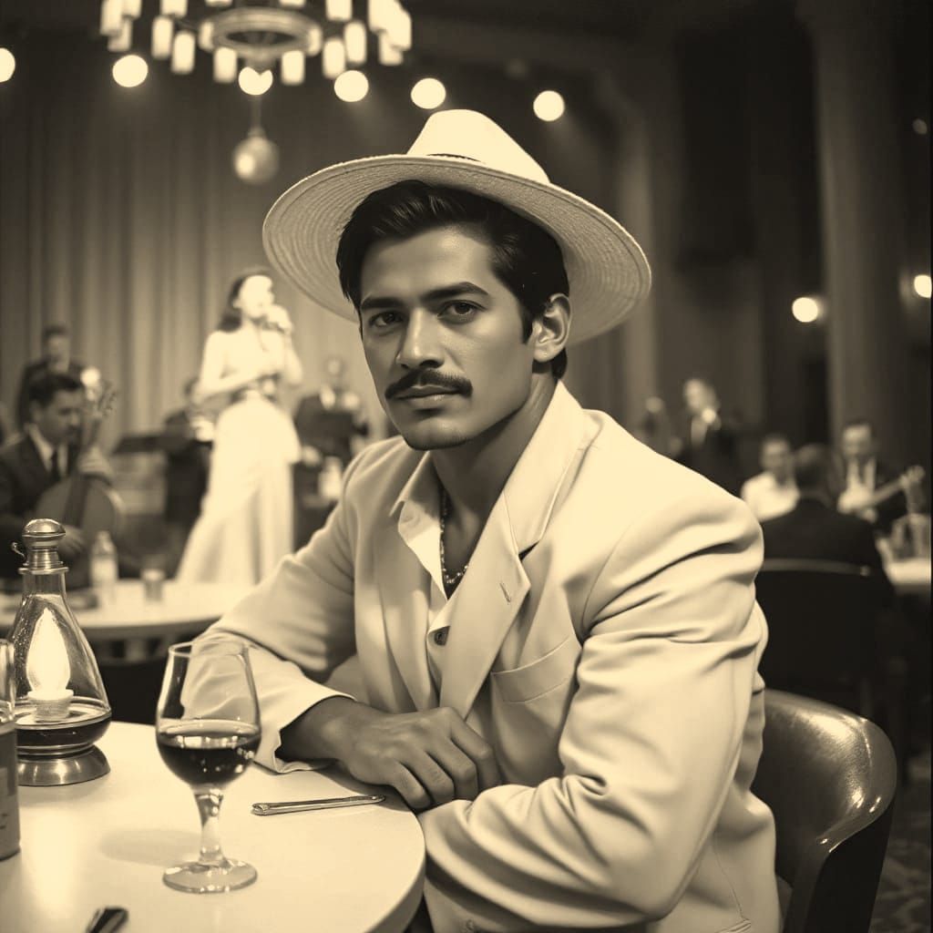 TOTAL BODY FIGURE. FEATURED: VERY HANDSOME CUBAN MAN. 30 YEARS. STRAIGHT BLACK HAIR COMBED BACKWARDS WITH POMADE. BEAUTIFUL, WELL-DEFINED FLESHY MOUTH. VERY THIN WELL TRIMMED MUSTACHE ABOVE THE UPPER LIP. SKINNY FACE. LIGHT OLIVE SKIN. HE HAS A GOLD CHAIN AROUND HIS NECK. DRESS WITH CREAM JACKET AND ...