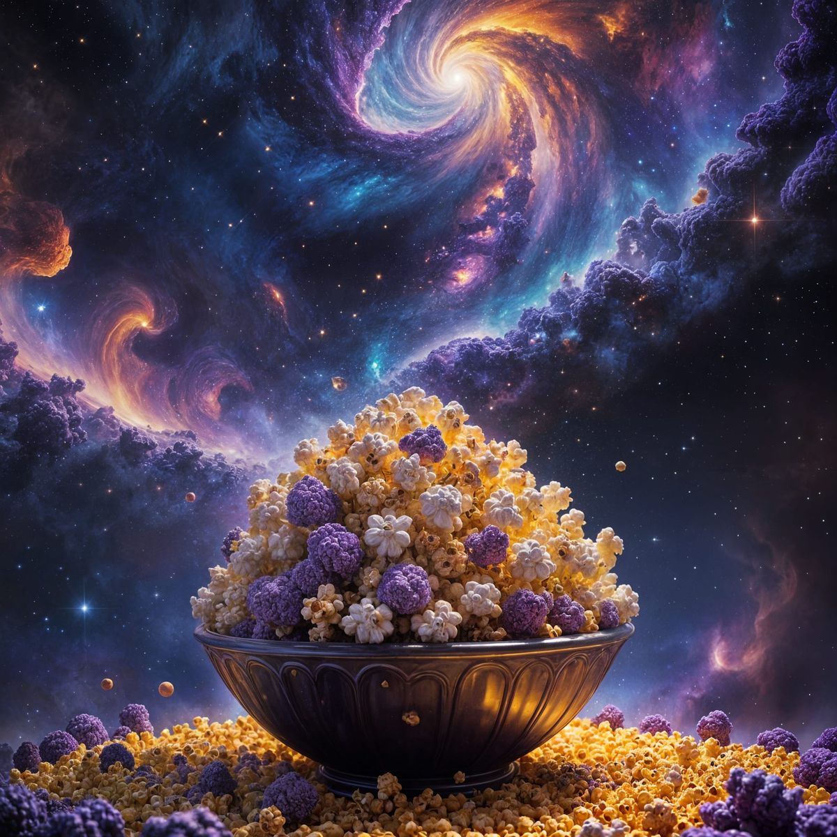 A breathtaking digital artwork of a giant popcorn sculpture set against a cosmic nebula. The image features vibrant colors and volumetric lighting, creating a surreal, cinematic scene.