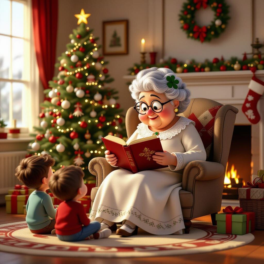 A heartwarming image of a grandma reading a book to children by a festive fireplace. Rendered in a bright, 3D digital art style with a cinematic feel.