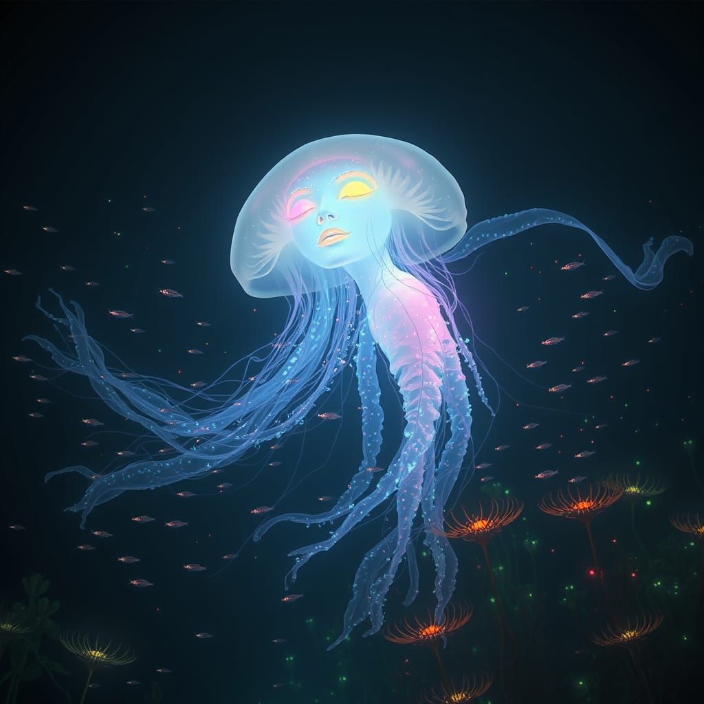 This image shows a woman with a jellyfish hybrid gliding through a dark ocean, surrounded by glowing fish and alien flora, in a hyperrealistic style with surreal touches