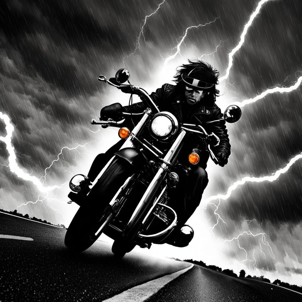 This image shows a lone motorcycle rider on a highway heading towards South Dakota. The scene is captured in a cinematic style, featuring dark, moody photography and dramatic lighting during an electrical storm.