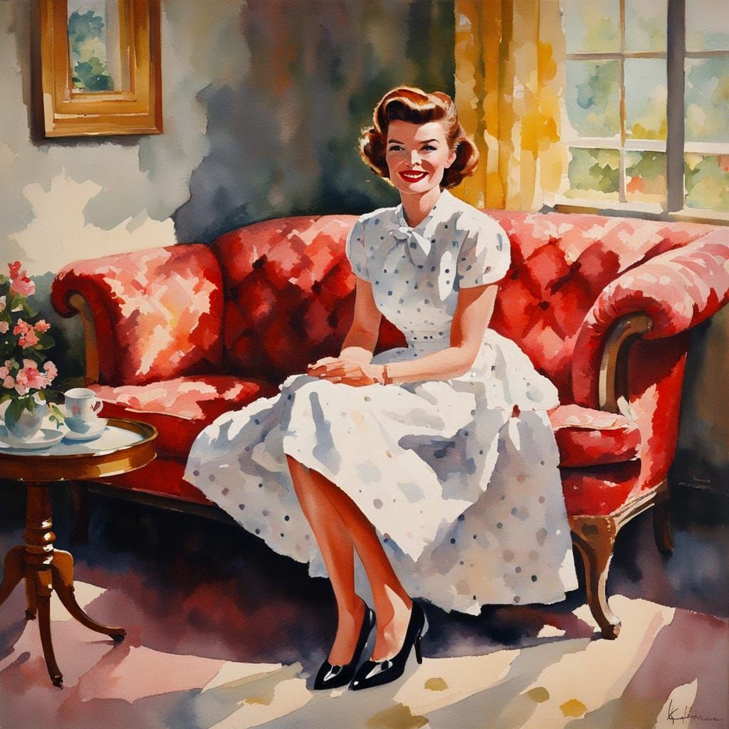 This image captures a serene moment of a stylish woman in a retro-inspired setting, surrounded by warm morning light and vibrant colors, as she relaxes on a cozy sofa.