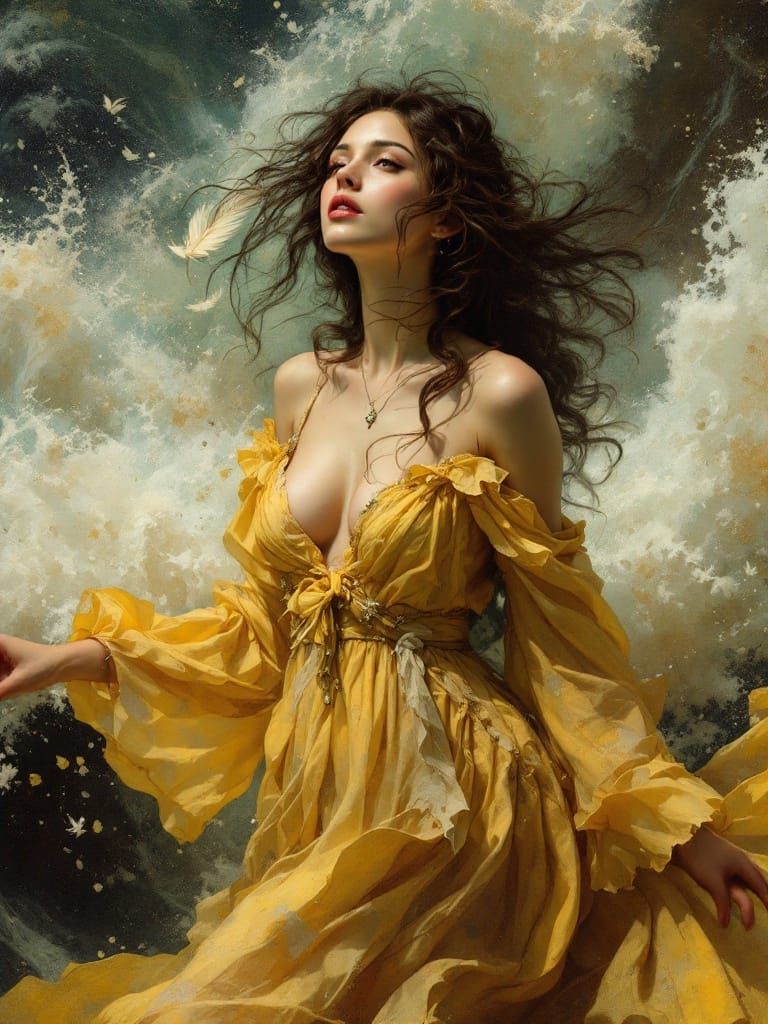This image shows a woman embodying freedom and strength, depicted in an art nouveau style. The soft, atmospheric background complements the idealized naturalism of the subject.