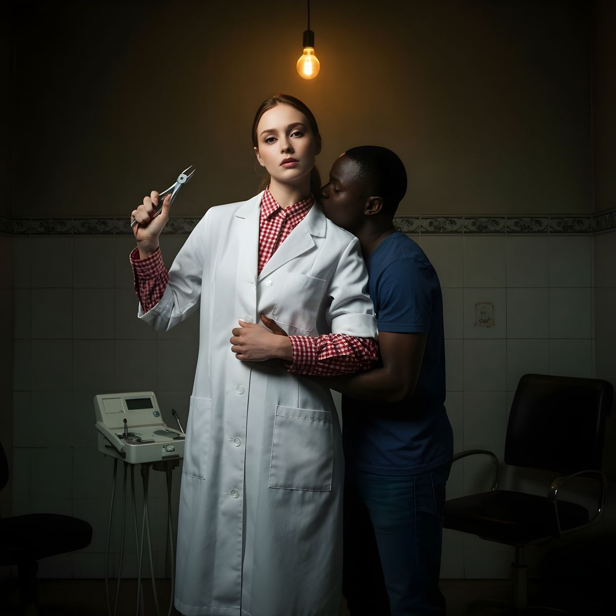 This image depicts a vintage dentist's office with a tall, attractive female dentist holding dental pliers and hugging a short, scared African man. The scene evokes dark fantasy and cinematic unease.