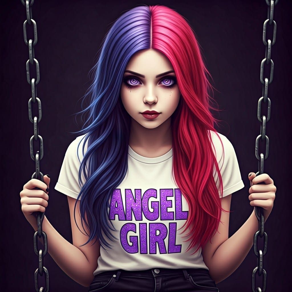 A striking close-up portrait of a teenage girl in a Gothic horror core aesthetic, featuring vibrant violet eyes and a bold, ombre hairstyle. She wears a purple glitter t-shirt and sits on a swing, set against a sharp, studio-lit backdrop.