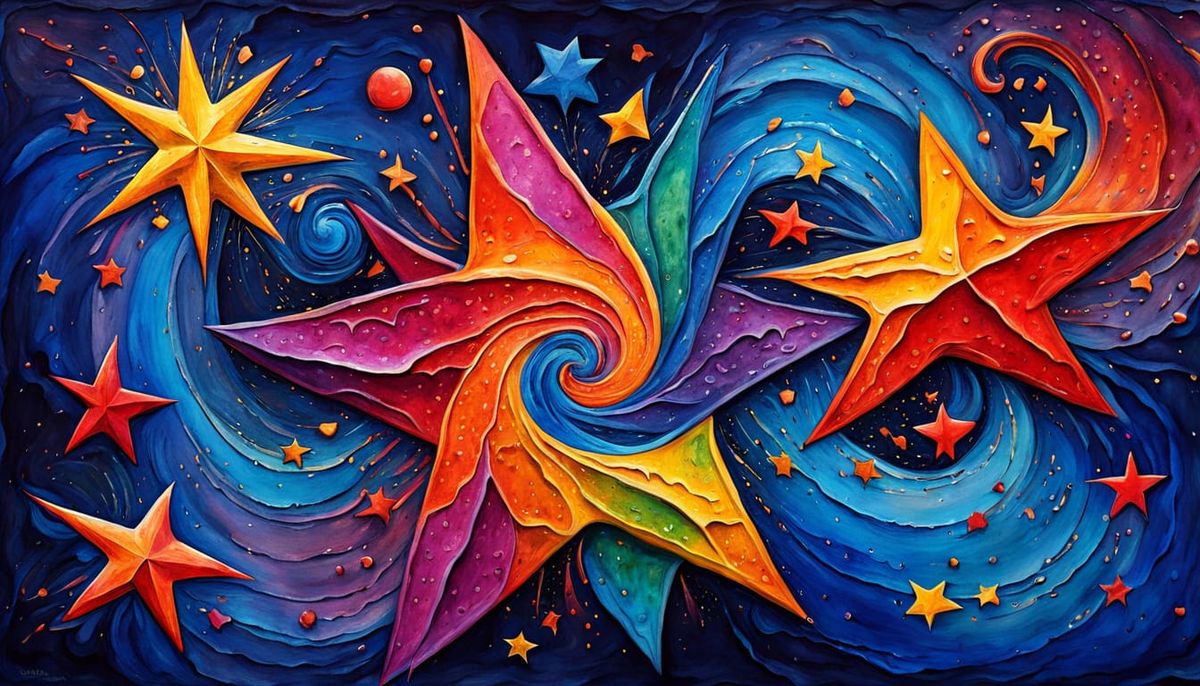 3D effect Giant Stars of different shapes, sizes and colors are falling into the center of a spiral vortex of Stars, large Stars are flying all around, alcohol ink watercolor painting in vivid colors on deep blue background., Miro, Kadinsky ink watercolor painting in vivid colors, Miro, Kadinsky-impressionism ...