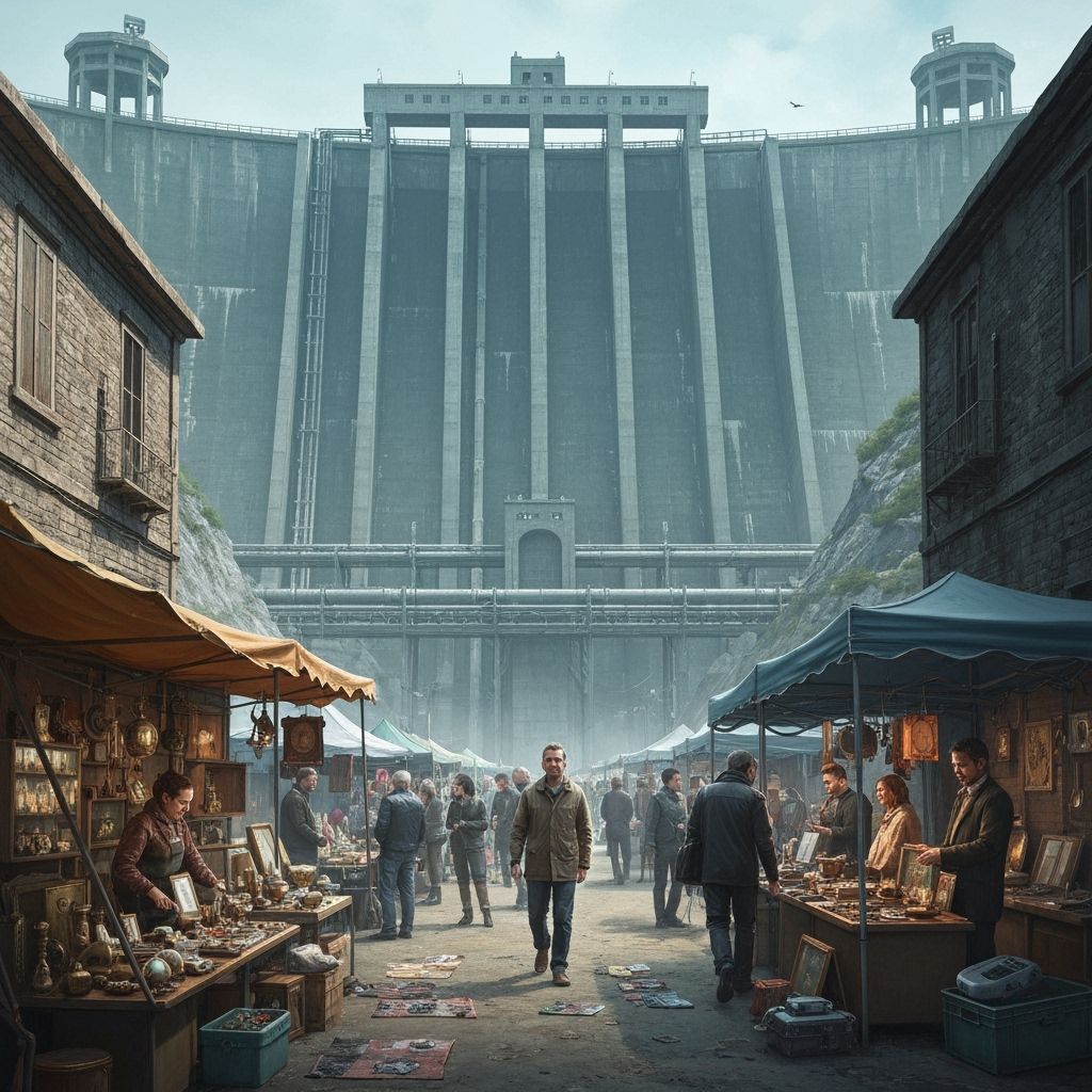This image shows a busy flea market with colorful stalls next to a huge dam. The scene blends dystopian and industrial themes, with a concept art aesthetic.