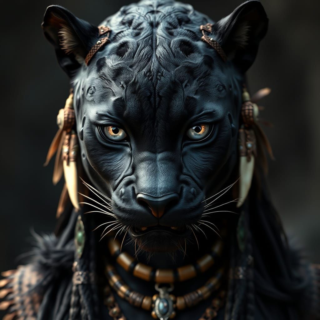 This image shows a powerful female hybrid with all-black fur and piercing silver eyes, adorned in intricate, primitive island native clothing, set against a dramatic background, blending elements of concept art and cinematic flair, with a focus on triadic colors and volumetric lighting.