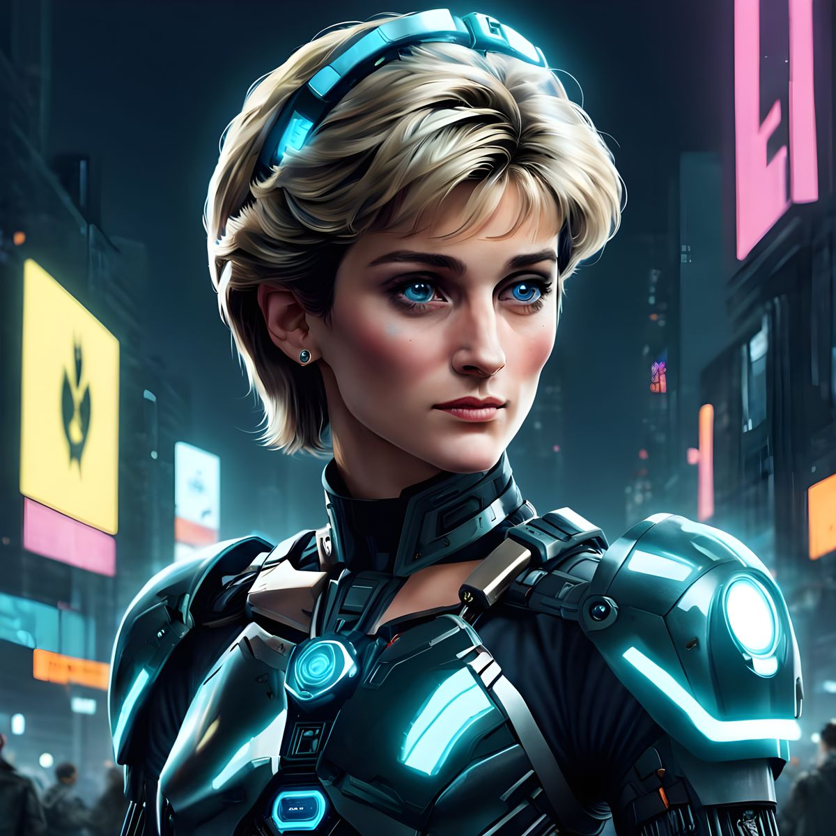 This image is a cyberpunk reinterpretation of a royal figure from the past, blending futuristic and regal elements in a striking visual representation.