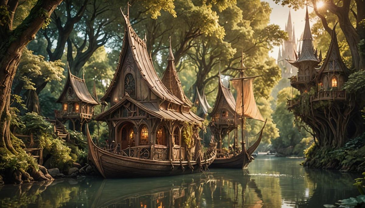 A breathtaking image showcasing an elven boat sailing on a tranquil river. Elven treehouses line the riverbank, captured with warm lighting, soft focus and earthy pastel tones in detailed 8K resolution.