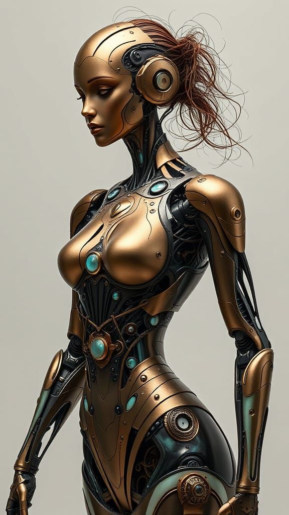 This image showcases a stunning mechanical woman with burnished bronze and opal-tinted alloys, her limbs articulated with precision and fine wires cascading like hair. A futuristic and elegant depiction with hints of art nouveau and clockwork mystery.