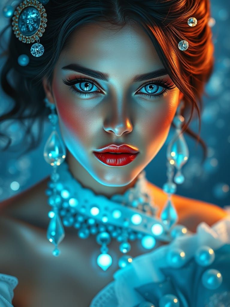 This image shows a captivating portrait of a woman with radiant skin and luminous blue eyes. She has an ocean-inspired aesthetic with clothing adorned with dangling crystals.