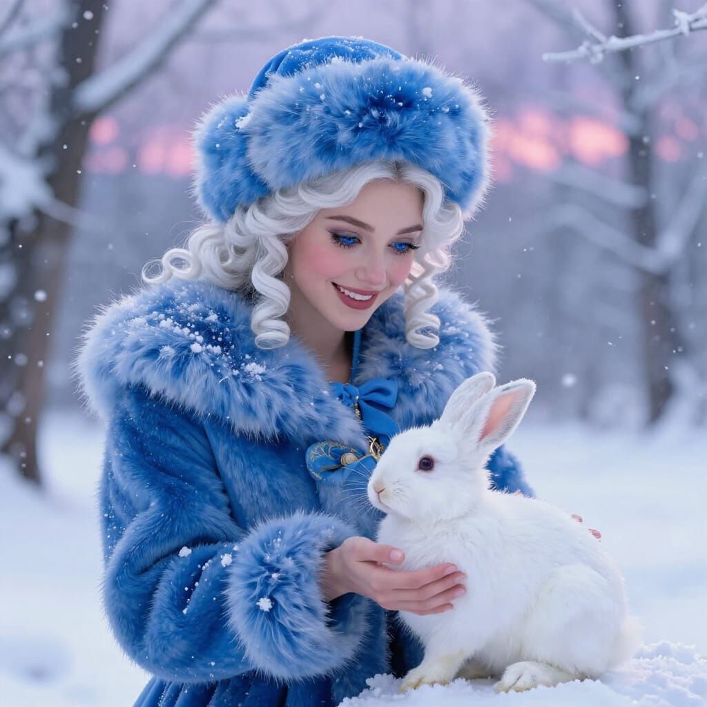 This image depicts a beautiful snow maiden with blue eyes and a smile, wearing a blue fur coat and cap, gently petting a white rabbit. Rendered in a realistic fantasy art style with intricate details and luminous lighting.