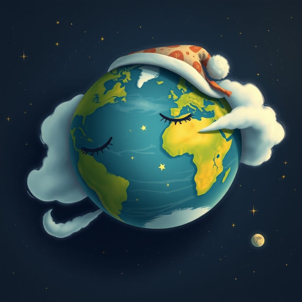This image shows Planet Earth as a sleepy character floating in space. The continents form a face with closed eyes, wearing a nightcap and wrapped in a star blanket, in a soft, painterly style.
